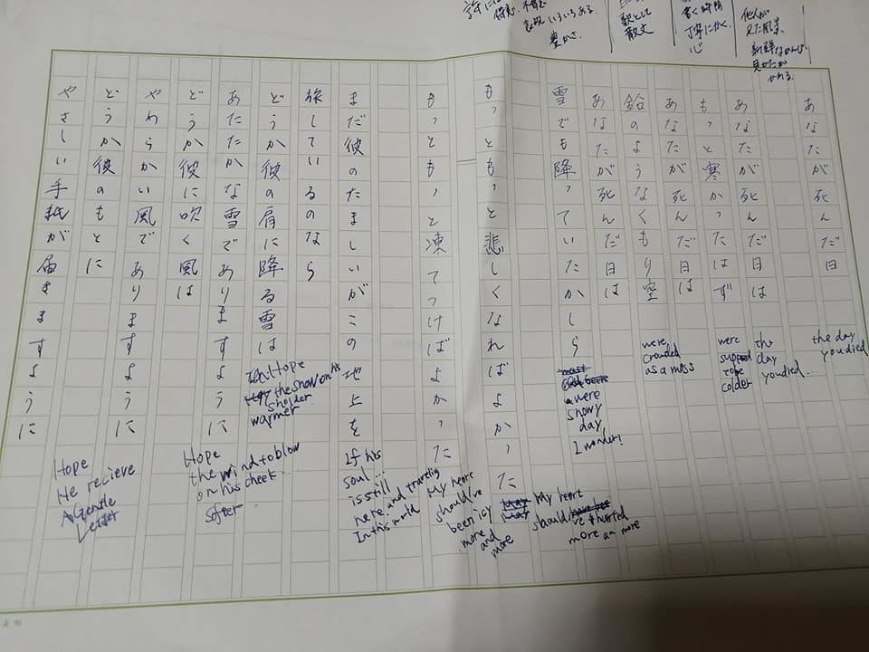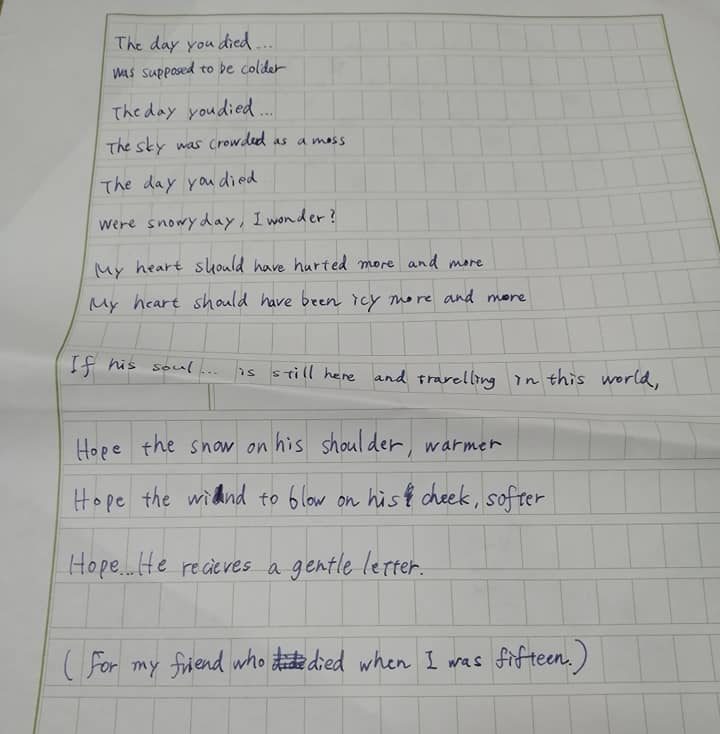 わたしはというと、16歳の冬に、病気で亡くなった級友のことを思い出して詩を書きました。
