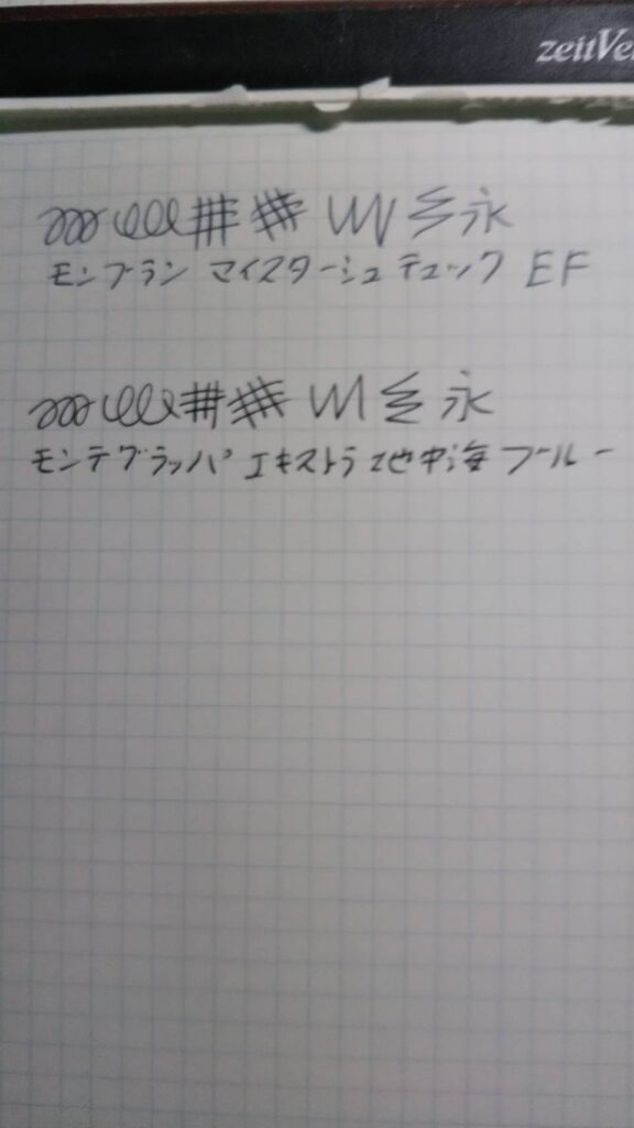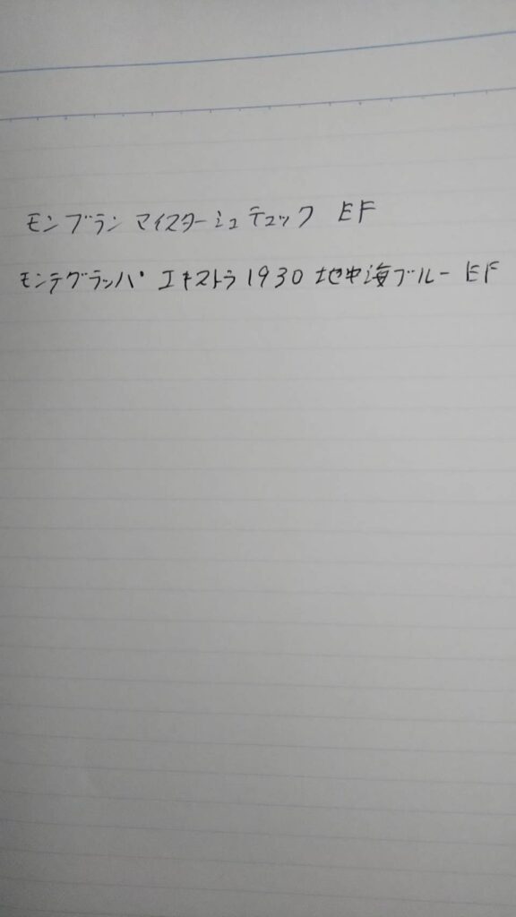 モンブランの『マイスターシュテュック ソリテール #146 シルバー・バーリー ル・グラン (EF)』とモンテグラッパの『エキストラ1930 地中海ブルー (EF)』で書いた文字を比較します。