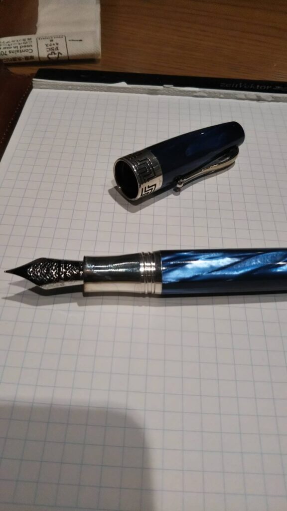 この万年筆のセルロイドは宝石のような鮮やかなブルーで、明るい部分と暗い部分のコンストラストが美しいです。