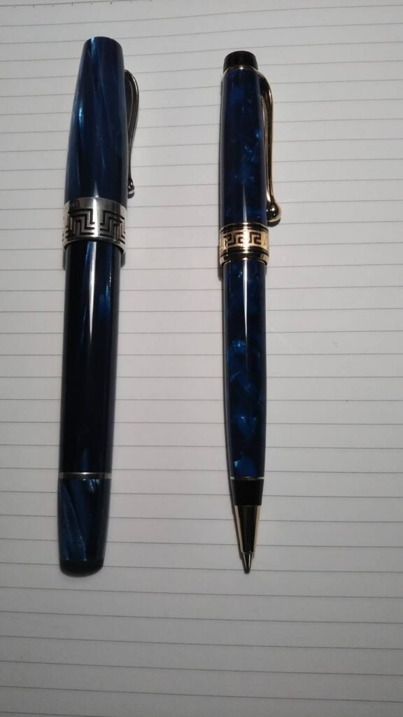 エキストラのセルロイドは波のようなブルーなデザインなのに対して、オプティマのアウロロイド (アウロラ製の樹脂) はガラスを散りばめたようなブルーです。